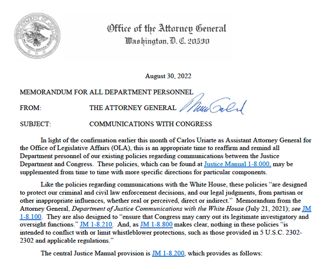 Attorney General Merrick Garland also sent a memo today reminding DOJ employees of the policies around communications with Congress.