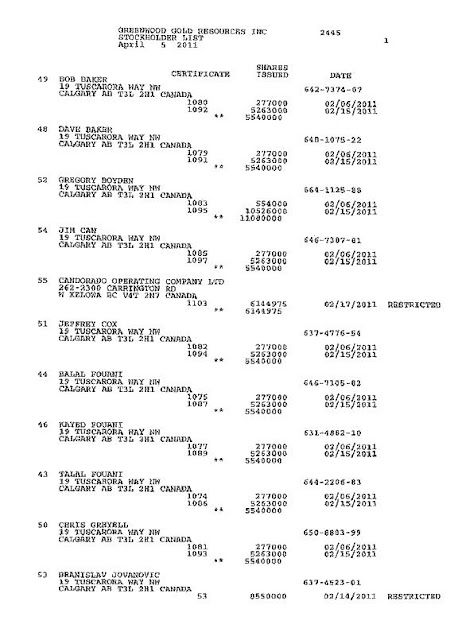 In fact, if you were to view the the shareholder list in its entirety, you would find that all 12 out of the identified individual shareholders use this residence as the registration address for their stock, . Many of them are found on Jim Can's Facebook friend list. It seems that maybe, just maybe, Can was already in control of this shell when it was Greenwood Gold Resources and that the reverse merger was a facade.