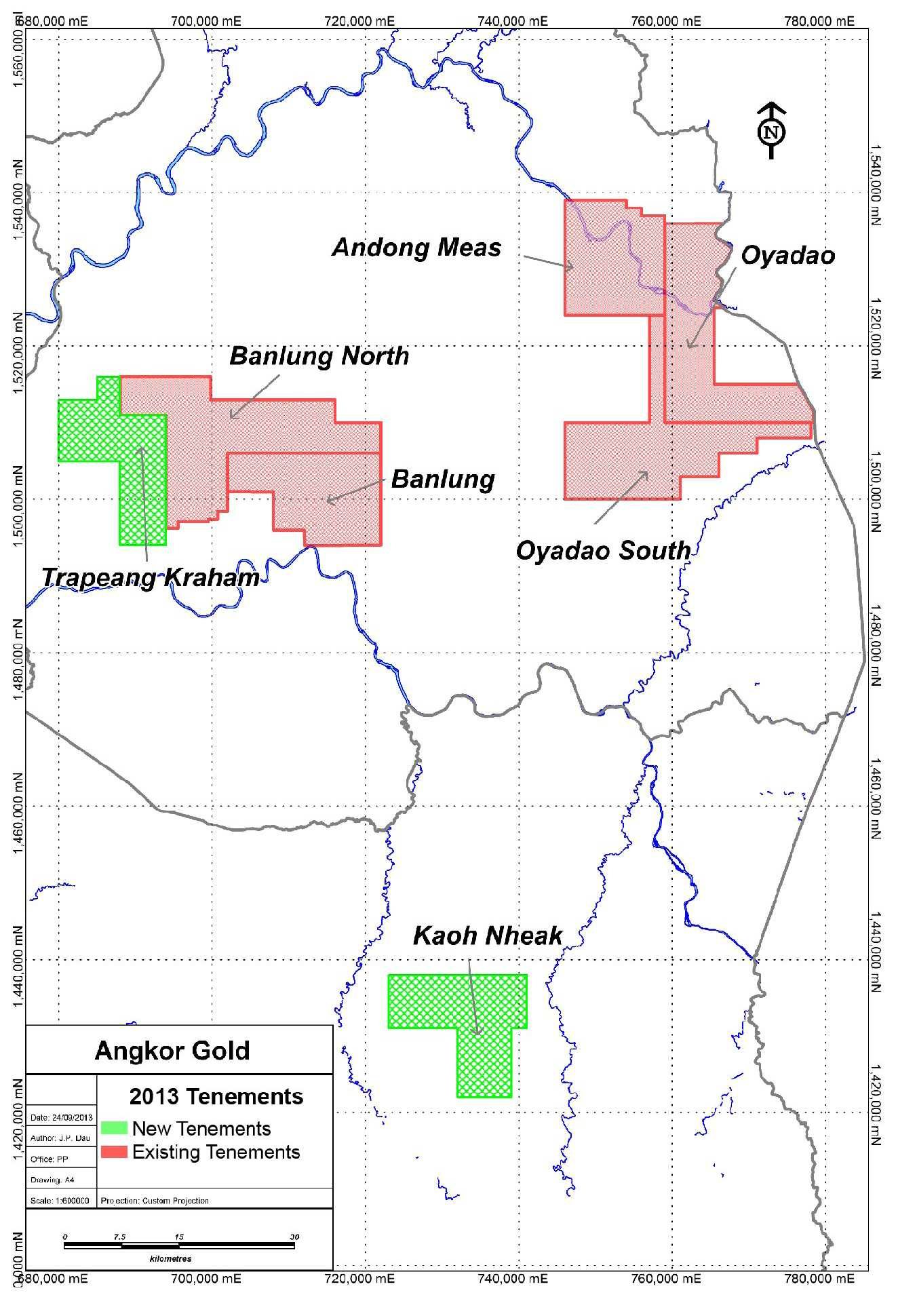 ANGKOR holds five other exploration licences in the Kingdom of Cambodia covering a total of 1102 km 2 , over which the company has been actively exploring over the past four years, all covered by stream sediment geochemical sampling, reconnaissance field mapping and geological mapping by satellite image interpretation. ANGKOR has flown low level aeromagnetic surveys over most of the ground, drilled 18,737 metres of NQ core in 148 holes; and has collected in excess of 20,000 augered 'C' zone soil samples and over 32,000 TMS in 12 centres of interest, over a combined area of 70km 2 , in addition to numerous trenches and detailed geological field mapping. Exploration on all tenements is ongoing.