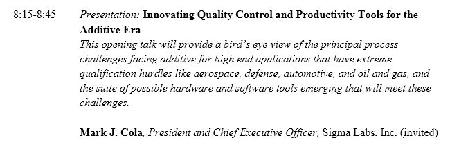 Only Sigma Labs holds the expertise in the field of quality assurance for metal additive manufacturing and their presentation will be seen by business strategists, investors, and innovators alike:
