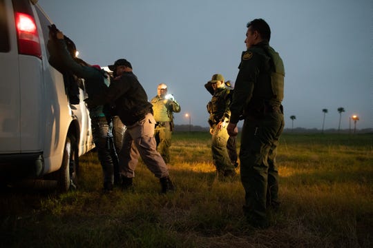 Border Patrol Agents take in to custody migrants shortly after crossing the river from Mexico near Mission TX, on Tuesday, Feb. 28, 2019.