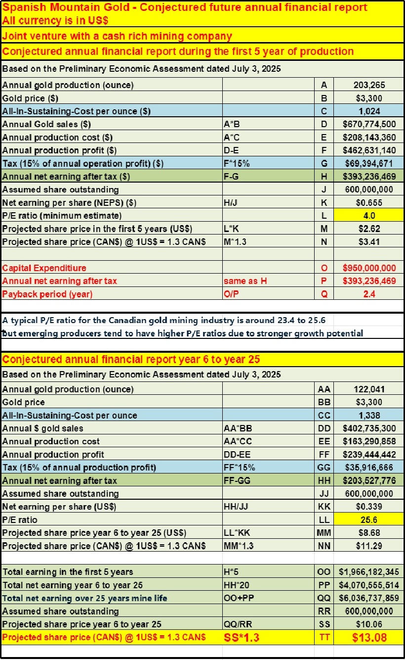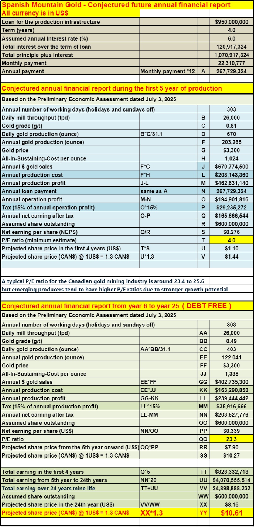 Since share price is forward looking and equal to P/E ratio x Earning per share, it could hit $11 long before the end of mine life is reached.