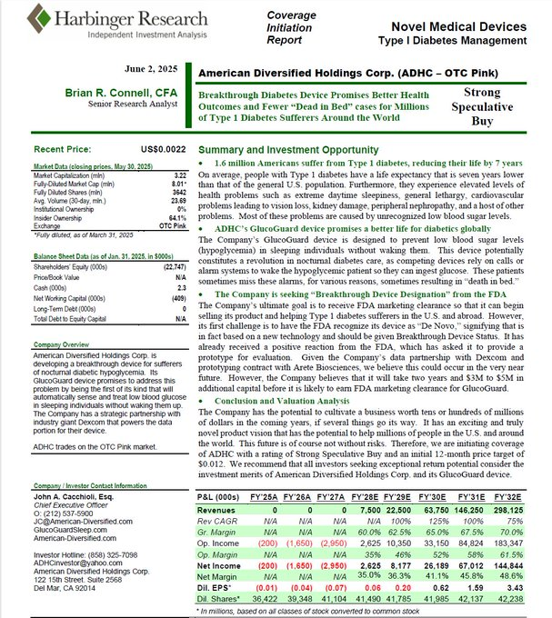 "Management views the $43 M enterprise value to be conservative due to ability of the GlucoGuard technology to meet the unmet need of hypoglycemia and the severe problems of "Death in Bed"," commented ADHC. "Additionally, this report does not incorporate GlucoGuards' AI and Predictive learning software components and related IP due to its developing nature," concluded ADHC.