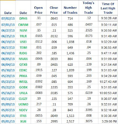 Notice a pattern? With few exceptions, The high trade of the day occurred within a couple of minutes of the opening trade. The notable exceptions on this chart are: WEQL , which also had Research Driven Investors' nine or so newsletters touting the stock concurrently with Darth Trader and even then, the stock hit its high within an hour of the open; UNLA , for which Darth Trader's emailed newsletters began to hit Inboxes 15 minutes after the open, which is later than usual; and, XUII , which was "picked" by Darth Trader concurrently with Victory Mark (Select Penny Stocks among others) and was already correctly rumored to be Awesome Penny Stocks next pick.