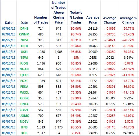 With the exception of TEWI , GOBK , UNLA and XUII , the number of losing trades, which we define as the number of trades above the closing price, is astounding. 15 of the last 19 Darth Trader "picks" all resulted in what should be an embarrassing number of losing trades of at least 66%, with ten of the "picks" at better than 90% losing trades. The average price per share paid for these stocks is considerably higher than the closing price, resulting in a significant per share percentage loss as well. These numbers remain pretty consistent throughout the rest of the "picks" listed on the Daily Trades Report. There are a few exceptions, as with those mentioned above, but then there are usually exceptions to any rule, especially in the penny stock world; and, as we pointed out earlier, XUII is an entirely different animal, having been promoted by both Victory Mark and Awesome Penny Stocks. The important thing to take out of this analysis is what you can expect more often than not, and that is that a Darth Trader "pick" will almost always create many more losers than winners, and that those losers will see a significant reduction in the value of their "investment".